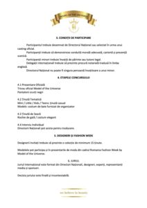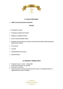 Model of the Universe este mai mult decât o competiție – este o experiență care îmbină eleganța, educația artistică și dezvoltarea personală. Pe parcursul celor trei zile, participanții vor avea ocazia să se pregătească alături de profesioniști ai industriei modei și să participe la activități care le vor dezvolta încrederea, expresivitatea și prezența scenică.