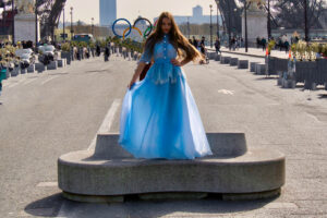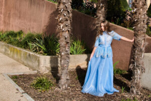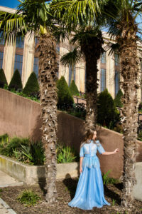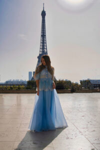 În rochia vaporoasă de un albastru luminos, Anastasia pare să devină parte din atmosfera poetică a orașului. Silueta delicată, părul lung purtat liber și eleganța gesturilor creează o imagine care amintește de editoriale de modă clasice, în care moda se întâlnește cu arhitectura și lumina orașului.