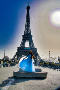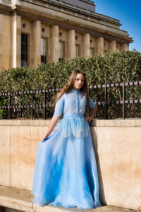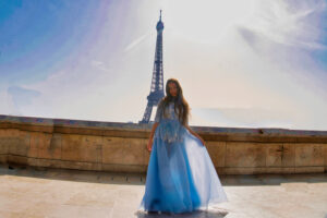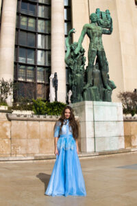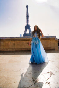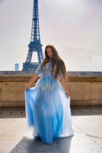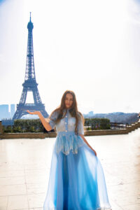 În unele cadre, Turnul Eiffel se ridică în fundal ca un simbol al visurilor îndrăznețe. În altele, liniile elegante ale arhitecturii pariziene și grădinile urbane creează un contrast subtil cu fluiditatea rochiei. Fotografiile surprind nu doar un model copil, ci o poveste vizuală despre începuturi, despre descoperire și despre frumusețea naturală a copilăriei.